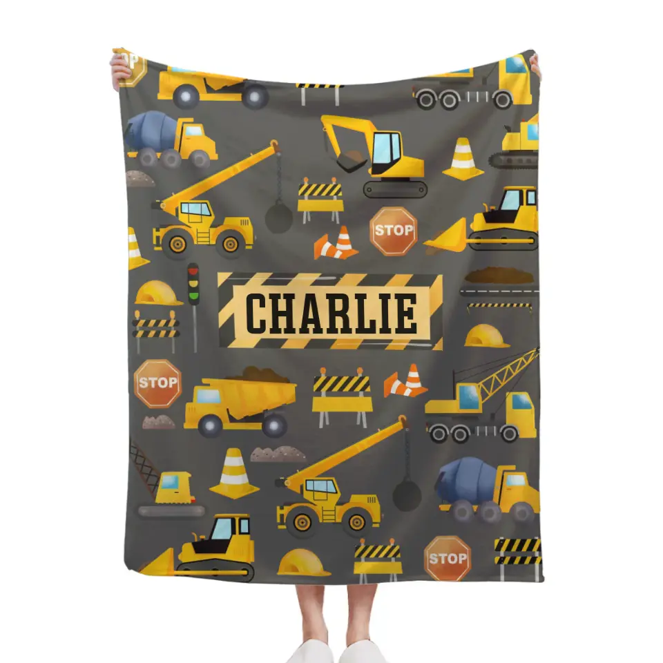 Personalized Builder Plush Baby Blanket Gift for Boys, Custom Truck Name Blanket