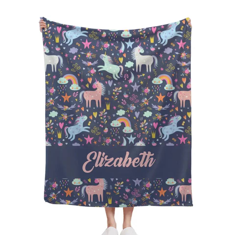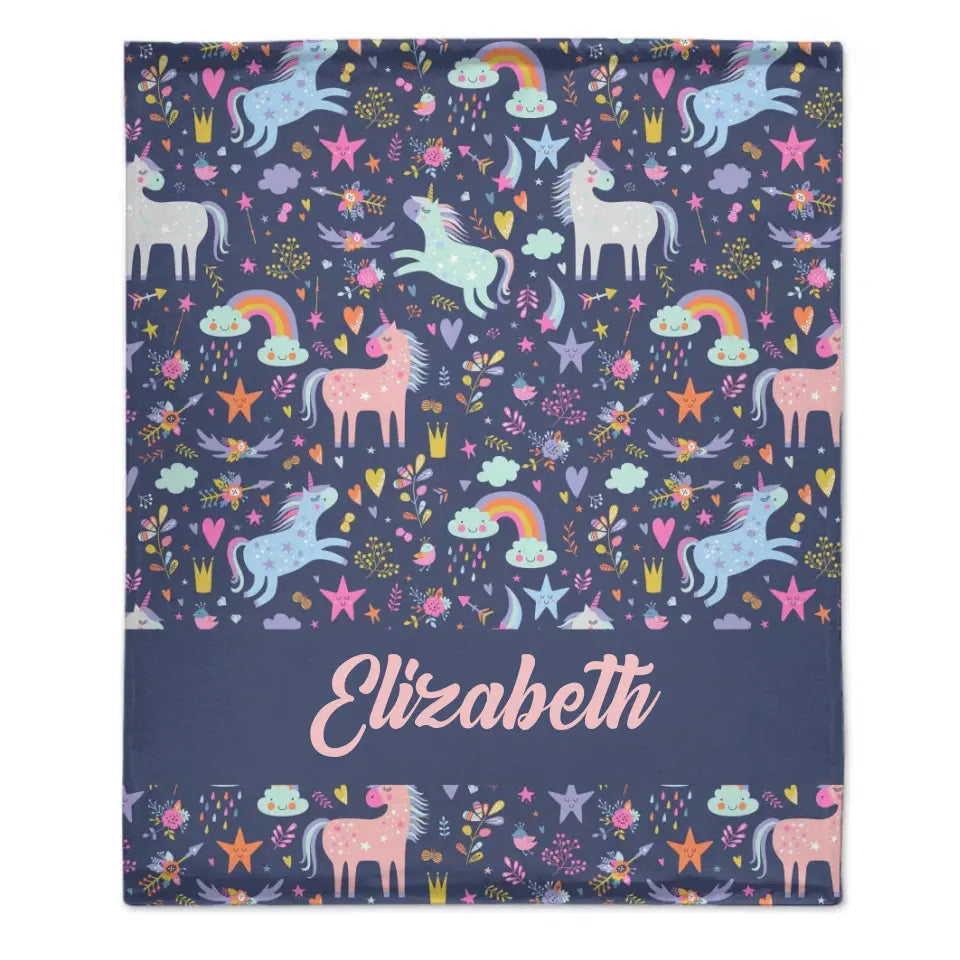 Personalized Custom Name Blanket - Clouds Raindrops Rainbow Stars Unicorn