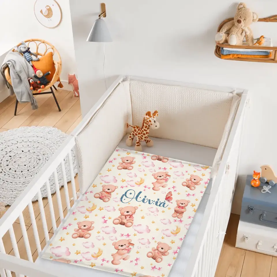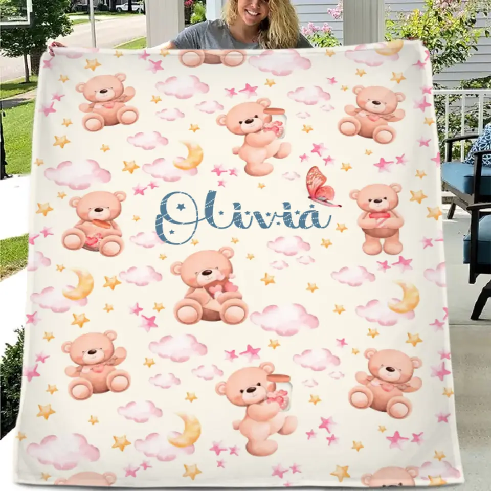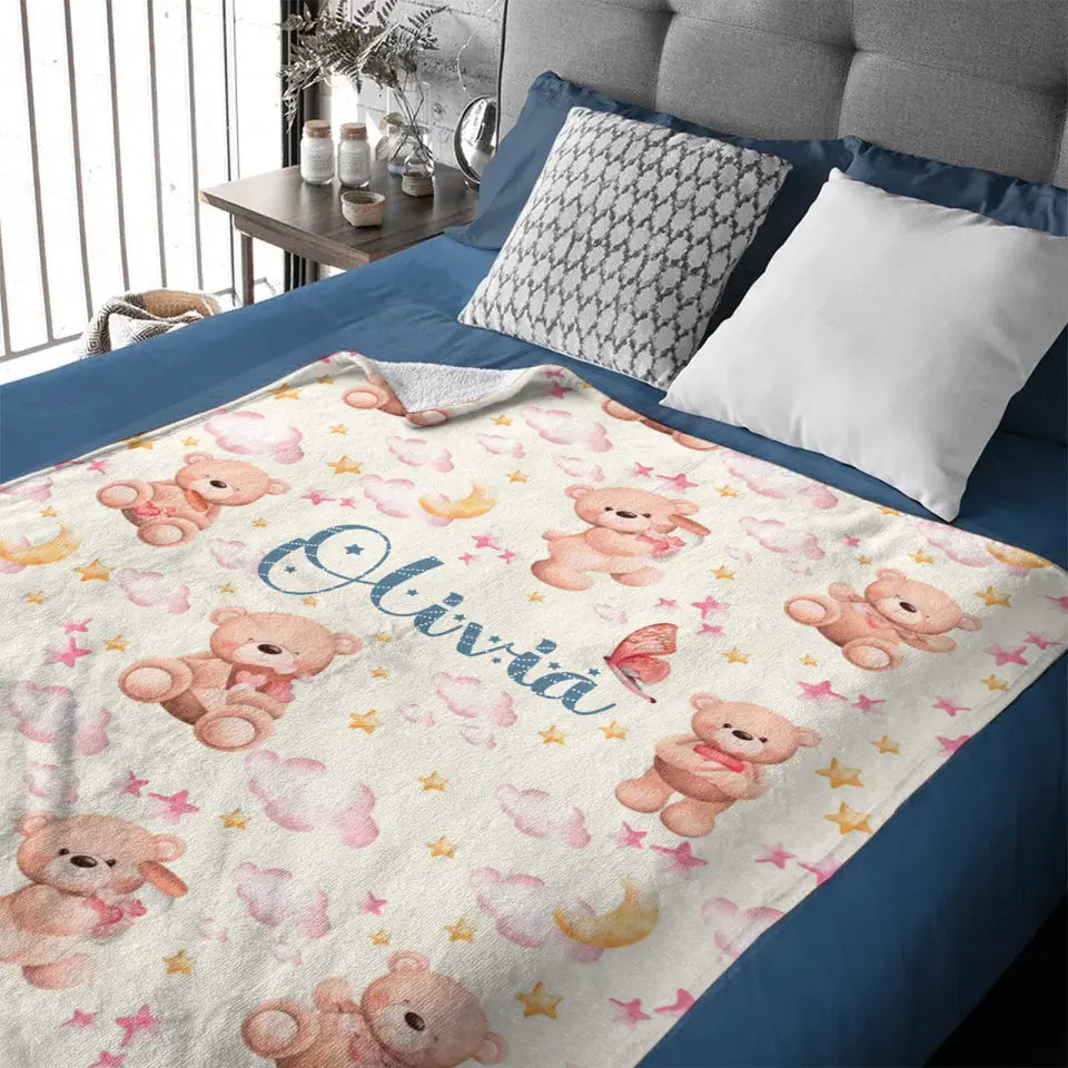 Personalized Name Baby Toddler Blanket For Girls - Pastel Colors, Bears, Stars, Clouds, Gift for Newborn