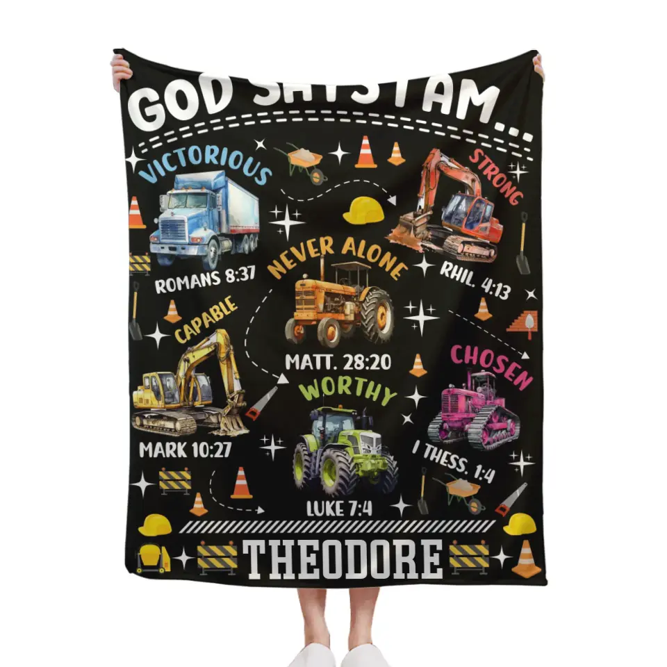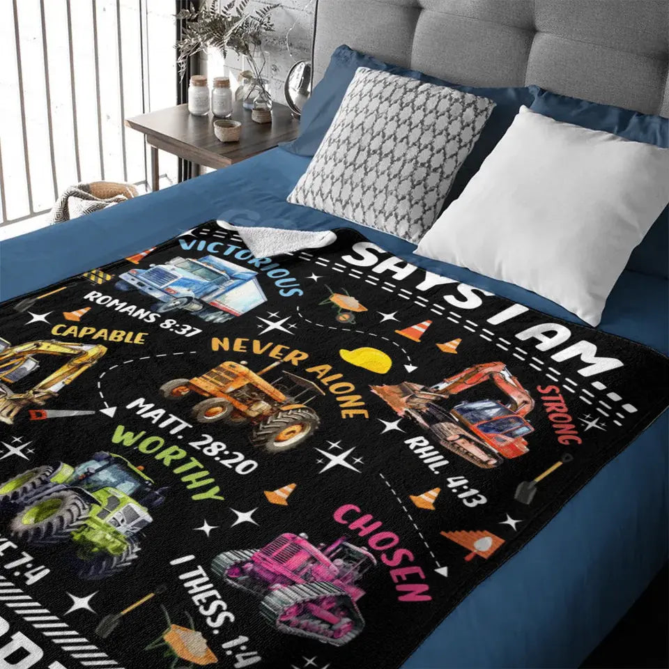 Truck Custom Name Blanket Personalized Text Gifts, God Says I Am Construction Bible Verse